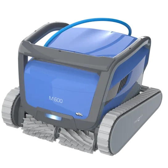 If you want a more advanced robotic cleaner for a larger inground pool, the Dolphin M600 is the premium option in this lineup. Maytronics describes it as a cleaner built around advanced technology and app-based control, with floor, wall, and waterline cleaning, multi-layer filtration, top-access filter access, included caddy, anti-tangling swivel, and MyDolphin Plus app support. It is listed with a 50 ft maximum pool length, 1.5, 2, and 2.5-hour cleaning options, and a 3-year warranty.